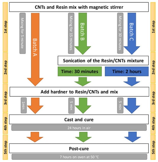 In Figure 1, a schematic block diagram summarizes the production process of the three types of batches (A, B, and C). The bi-component epoxy resin, used as a matrix for the CNTs, is the “MATES SX8 EVO” while the CNTs are of the multi-wall type. The properties of the resin, hardener, and CNTs are listed in Table 1.