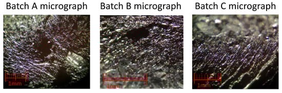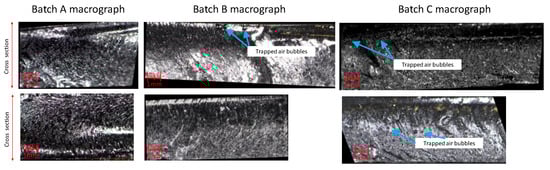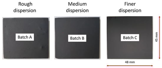 Looking at Figure 8, it is possible to notice some air bubbles trapped on the epoxy matrix of Batches B and C, which are not visible in Batch A. The air bubbles spotted on Batches B and C were probably generated by the longer mixture time in the third step of the manufacturing process (5 min of Batches B and C compared to 1 min of Batch A).