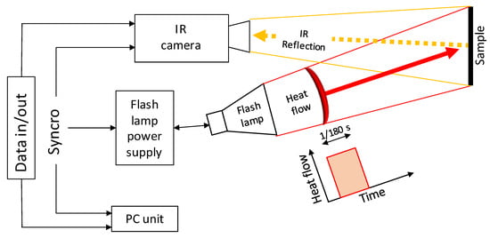 In this work, the experiments were performed using an InSb cooled IR camera (FLIR Systems, Wilsonville, OR, USA), FLIR X6540sc, equipped with a 25 mm F/2.0 lens (with field of view H × V = 21.74° × 17.46°). The heat source is an Elinchrom Flash lamp with a pulse of 4800 W/sec powered by a couple of Elinchrom 2400 rx in a parallel configuration.