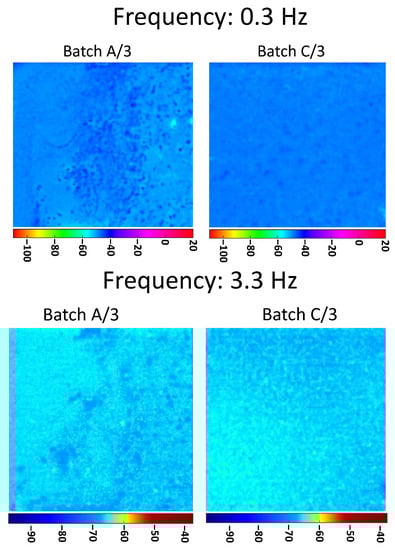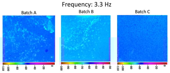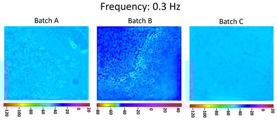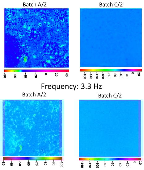 In Figure 5, the phasegrams for the three batches, A, B, and C, calculated at the selected frequency of 3.3 Hz (high frequency), are shown. In the PPT algorithm, the investigation at higher frequency corresponds to a shorter distance from the inspected surface. Still, here in Figure 5, there is a clear difference between the dispersion of the nanoparticles on the three batches, which results in agreement with the corresponding manufacturing processes.