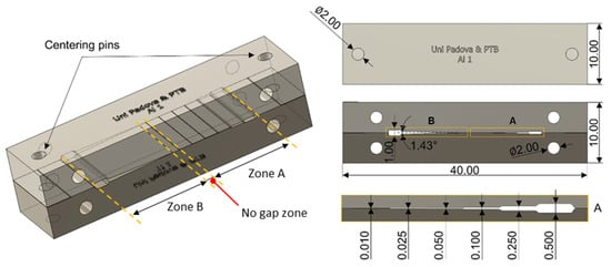 In order to evaluate the performance of the analysed algorithms, a set of metal and composite standards designed by the University of Padova and the PTB was used. These standards were presented in [2] and were specifically designed to evaluate the capability of CT systems for measuring gaps in single and multi-material parts. Each of these standards is composed of two parts that can be made of the same or different material. Each one of the two parts has a stepped surface and a tempered plane machined. When the two parts are assembled, stepped air gaps are generated in one part and a wedge air gap in the other. The nominal thickness of the stepped gaps ranges from 500 to 10 µm (zone A in Figure 1) and the nominal wedge gap ranges from 450 to 0 (no gap) micrometres (zone B in Figure 1). A 1 mm step gap is also generated at zone B, just before the wedge zone begins. The design of the reference standard is shown in Figure 1.