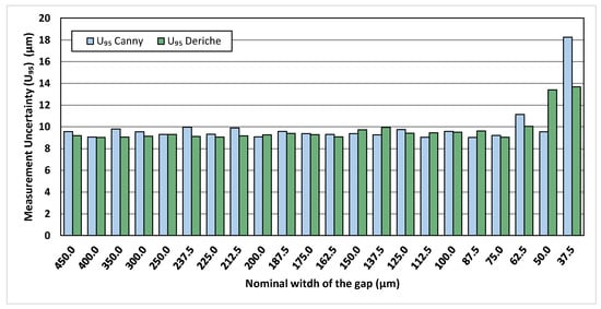 Furthermore, it can be observed that in all the standards used, the measurement errors along the different thicknesses of the gap show lower variability when the Deriche-based algorithm is used. In addition, the measurement error begins to increase and to show a different trend when the thickness of the gap is equal and smaller than 75.0 µm. The obtained expanded uncertainties using both algorithms show values below 10 µm for gaps larger than 62.5 µm, and higher values for gaps equal or smaller than 62.5 µm.