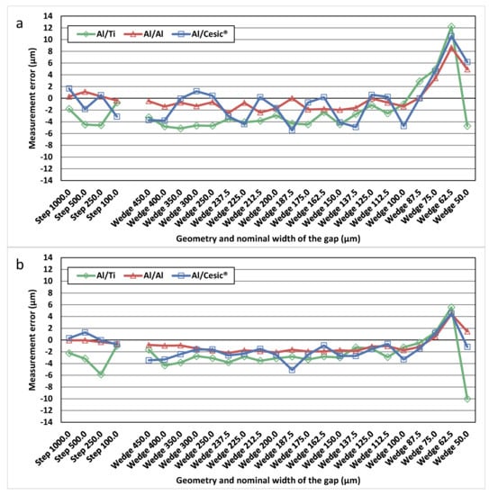 The obtained results show that in all three analysed cases, the measurement error is between 2 and −6 µm except in the areas with a very narrow gap, where the error increases. The measurement error is generally lower for the single-material (Al/Al) standards than for multi-material standards. This effect can be observed with both algorithms, although the differences are slightly smaller when applying the Deriche-based algorithm.