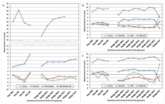 It was also observed that the variation in the measurement error along the gap is clearly smaller in the Deriche-based algorithm than in the Canny-based one. Since this aspect had already been observed for other geometries and materials in previous works [14,15], it can be concluded that this better performance of the Deriche-based algorithm is also achieved when measuring difficult-to-measure geometries such as very narrow gaps. Making this same comparison between the Deriche-based and threshold-based algorithms, the differences are not significant, although Deriche might present a slightly lower variability. If error correction techniques are used, this lower variability would simplify the process and improve the accuracy of the corrected measurements.