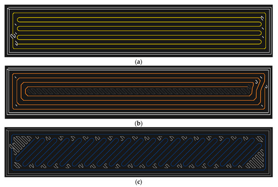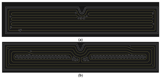 Two configurations were studied: (I) a “sandwiched” configuration with 8 reinforced layers equally distributed in the vertical direction (on a total of 100 layers—Figure 10a); (II) a “plain” configuration with only reinforced layers (92 layers in total—Figure 10b). Both configurations have a top and bottom part made of 4 layers of nylon matrix.