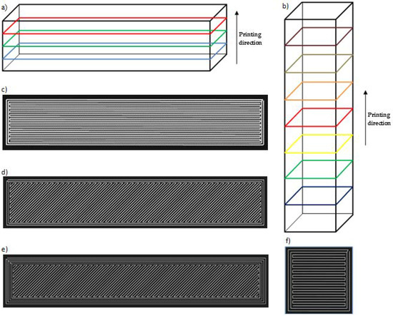 The printing direction and deposition of material: (a) the specimen with the base on the XY plane; (b) printing the specimen with the base on the XZ plane; (c) material deposition in the lamina under the angle 0/90 with two rings; (d) material deposition in the lamina under the angle 45/−45 with two rings; (e) specimen with four rings; (f) material deposition in the lamina under the angle 0/90 with two rings.