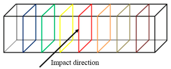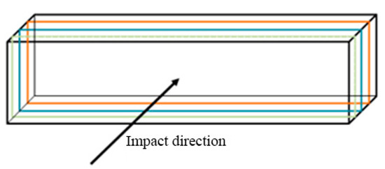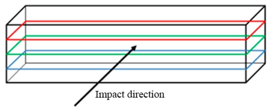 In the case of the impact bending tests, specimens of the composite material need not be notched. Because previous studies [35,36] were performed on notched specimens, the authors considered a similar type of specimen. The authors decided to perform the experiment on non-notched samples after careful consideration. The reason is the significant influence of the notch on the mechanical behaviour of the specimen under impact loading and the problematic deposition of reinforcement in the notch area. The fibre rings would copy the shape of the notch in the case of a notched sample. The strength of the material in the notch area will be reduced due to the change in the direction of the fibre and the fibres would be loaded by bending stress. The deposition of the fibre around the notch will show inhomogeneity (Figure 2).