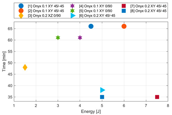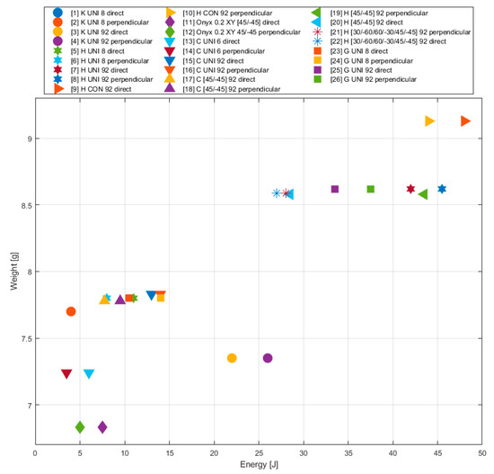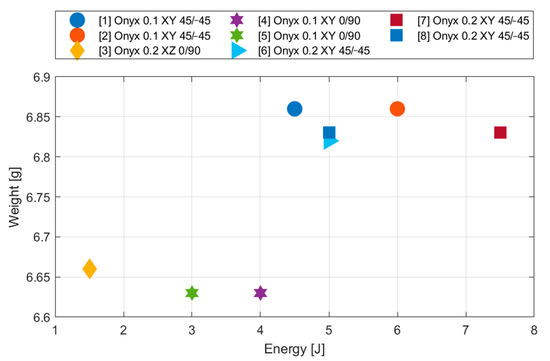The specimen weight was the first monitored parameter in the complex analysis. In the case of this type of diagrams, the individual specimen types are defined in the legend as follows: serial number; material; lamina thickness; base plane; filament orientation. From the point of view of the weight, the differences between the specimens are negligible—the differences are at the level of 3%. When we compare the ratio of the energy absorbed by the specimen and its weight, the specimens from the series No. 7 show the best results (7.5 J). The worst results were achieved for the specimen printed vertically (1.5 J).