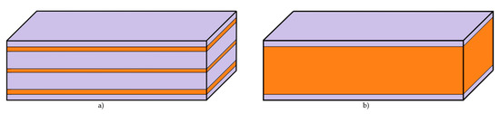 Configuration of reinforced layers in the structure of continuous fibre reinforced thermoplastic (CFRTP) composite (orange—fibre, purple—matrix): (a) Specimen reinforced with continuous fibres in 8 layers; (b) the specimen reinforced with continuous fibres in 92 layers.