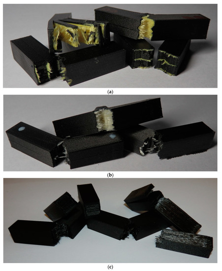 The selected matrix material was nylon reinforced with chopped carbon fibre (Onyx trademark), whose deposition strategy used in the case of continuous fibre reinforced thermoplastic (CFRTP) composites is shown in Figure 4d,e. The number of the reinforced layers with the continuous fibre varied as it is dependent on the lamina thickness. The lamina thickness is a parameter adjusted by the printer manufacturer for each type of the reinforcing fibre. In the case of the glass, HSHT glass and Kevlar fibre, the thickness of one layer can be only 0.1 mm, i.e., the specimen was divided to 100 laminas. In order to assess the effect of the presence of fibre on the impact toughness, samples reinforced with Kevlar, glass or HSHT glass fibres were divided into two groups according to the number of reinforced layers (Table 4).