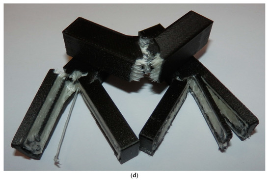 After realising the analysis on the specimens reinforced with the short carbon fibre, we carried out the same tests on the specimens reinforced by the continuous fibre (Figure 10) and observed the same parameters—weight, volume, time, printing costs and the amount of absorbed energy. The specimens were reinforced by the carbon, Kevlar, glass and HSHT glass fibre that can be arranged in a 45-degree orientation, longitudinally, in concentric rings or in a mixed way in the structure (Figure 11). We selected the following strategies of arranging the fibre in the specimen (Table 4).