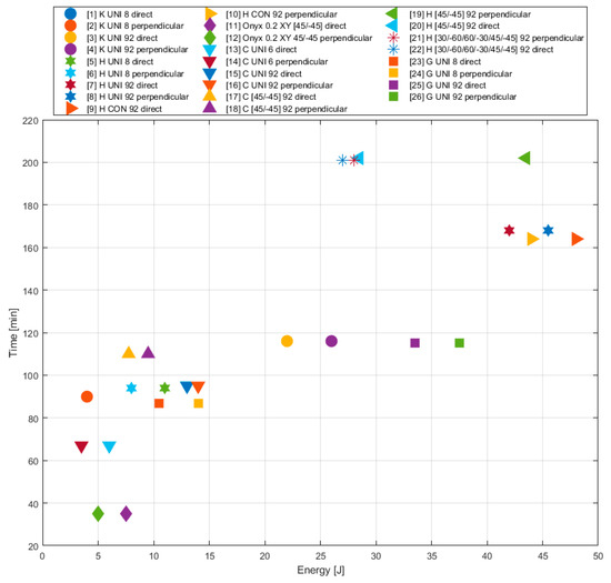 From the point of view of the fibre arrangement—the specimens with the HSHT fibre arrangement 45/−45 and 60/30/30/60/45/−45 take the longest printing time—the printing time of one specimen lasts more than 200 min. The probable reason is the different composition of the lamina structure. In the case of the arrangement 45/−45, gaps develop between the specimen walls and the fibre, and they have to be filled with Onyx (Figure 11c). Other strategies for HSHT fibre result in a 15% decrease in printing time. When monitoring the effect of the deposition strategy in the case of carbon fibre, the decrease was at the level of 13.6%. This is a relatively comparable value to HSHT glass fibre. The concentric ring strategy is therefore the best choice given the amount of the absorbed energy (Figure 14). To select a suitable fibre type, glass fibre is offered as a good alternative to HSHT glass fibre (Table 8).