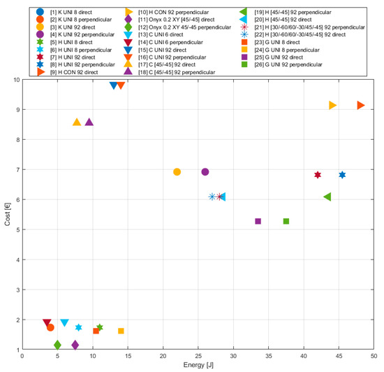 The fibre storage strategy generally has less impact on cost than the choice of fibre type. The lowest production costs were in the 45-degree orientation arrangement of the fibre in the structure. However, when monitoring the effect of stratification parameters on the amount of absorbed energy, the application of concentric rings is a more suitable alternative (Table 9).