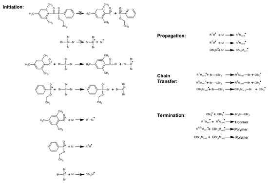 The cotelomerization process of BA, AA and ABP were initiated using the radical photoinitiator Omnirad TPOL (0.1 phr; per hundred part of the monomers mixture) and tetrabromomethane (2.5 phr) as telogen was used. Mixtures of monomers and samples’ symbols were showed in Table 1. The reaction mechanism was presented in Figure 1.