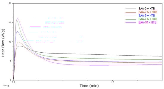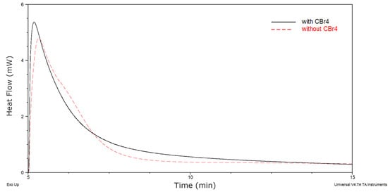 As can been seen, the viscosity and solid content of cotelomers solutions decreased significantly as the acrylic acid content increased (η = 47.6 Pa∙s and SC = 91.4% for sample without AA and η = 9.1 Pa∙s and SC = 70.3% for BAA cotelomer with 10 wt % of AA). Interestingly, the molecular weights measurements exhibited very similar values of molecular weights (Mn ca. 12,200–14,100 g/mol and Mw ca. 18,600–21,700 g/mol) regardless of the AA content. The obtained values are much lower than in the case of bulk photopolymerization without the use of a classical chain transfer agent [17]. Additionally, the PDI values amounted to ca. 1.52–1.55 a.u. (slightly lower value of PDI was found for the sample without acid, i.e., 1.51 a.u.). That means that obtained cotelomers characterized low polydispersity index as in the case of polymers obtained by the ATRP method and near unimodal molecular weight distribution (1.1–1.2) [42]. It is known that molecular weight distribution of polymers affects the mechanical properties [43]. Preparation of polymers with such a low PDI index and low molecular weights was possible due to the use of a chain transfer agent (CBr4). Additionally CBr4 acts as telogen in the process. Due to this, the obtained products can be called cotelomers. Interestingly, the photo-DSC measurements revealed that CBr4 also can act as photoinitiator. Barson and coauthors showed that UV-induced telomerization of styrene in the presence of bromotrichloromethane without the photoinitiator taking place [24]. They proved that CCl3Br acts both as a photoinitiator and as a transfer agent. We tested two systems: without CBr4 and with CBr4 (both contained a photoinitiator TPOL). The photo-DSC thermogram was shown in Figure 2. It is known that heat flow rate is proportional with the polymerization rate [44]. The system containing CBr4 reached a higher value of heat flow than the system without CBr4, hence the conclusion that a sample with a telogen polymerized faster. On this basis, it was found that the CBr4 molecule also acted as a photoinitiator (the same as CCl3Br in the Barson’s work). The observed increase in the reaction rate was most likely due to the generation of additional radicals from the telogen molecule.