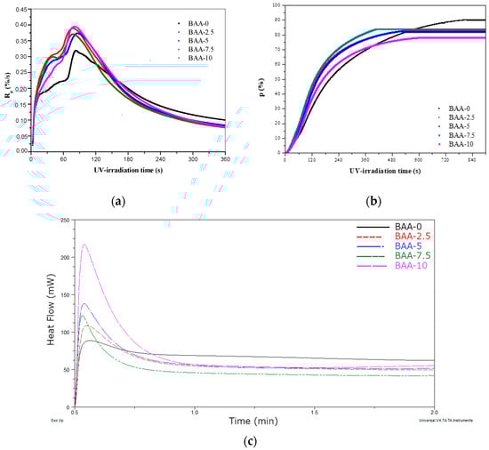 The heat flow for a sample with CBr4 was higher than for samples without CBr4. Additionally, photo-DSC measurements revealed that the UV-induced cotelomerization process was faster in the presence of acrylic acid. In Figure 3a the kinetics curves were shown. The polymerization rate (Rp) values were higher for systems with AA (the highest values was noticed in case of 10 wt % of AA). It is also characteristic that the maximum reaction speed (maximum peak on the curves) was reached after ca. 90 s of UV irradiation. Moreover, a second peak on the curve is discernible (most visible in the case of sample BAA-7.5), which may confirm a double way of initiating a reaction (by radicals generated from photoinitiator and telogen photolysis). Regarding the conversion of acrylate groups (p, Figure 3b), it should be noted that the highest final conversion was achieved by the sample without AA (90%) but after the longest UV irradiation time (ca. 840 s). This is due to the lower polymerization rate (Rp) of this system (Figure 3a). Samples with 2.5 and 5 wt % of AA exhibited a very similar profile of conversion curves and the final conversion value (82% and 83%, respectively). The sample BAA-7.5 also achieved high final conversion (84%), but in shorter UV irradiation time (ca. 360 s). The lowest value of final conversion was noticed to the system with 10 wt % of AA (75%). In the case of a sample without AA (BAA-0), it can be said that we are dealing with a linear photopolymerization of a difunctional monomer (ignoring the ABP influence, which is only 1 wt % in the system). It is known from the literature that such systems are characterized by high conversion values [45].