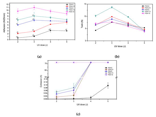 The self-adhesive properties of PSAs film based on BAA cotelomers, i.e., adhesion to steel substrate, tack and cohesion at 20 °C, tested according to the UV dose used in the step of the crosslinking process (2; 3; 4 or 5 J/cm2) were presented in Figure 6. As can be seen in Figure 6a, adhesion values for all PSAs films UV crosslinking with doses 2 or 3 J/cm2 increased, regardless of the AA content. In contrast, for samples PSA-0 and PSA-2.5 the adhesion values increased with an increase of UV dose, while for PSA with more content of AA a decrease in adhesion values was noted. It is related to the higher cross-linking density of the samples PSA-5; PSA-7.5 and PSA-10, which contained more acrylic acid and more unreacted monomers in adhesive composition before the UV crosslinking process. It is known from the literature that an increase in the cross-linking density of adhesives reduces their adhesion [48]. In the case of samples with a high acid content (PSA-10), no damage was observed, regardless of the UV dose used. The conducted tests also proved that the adhesion of PSAs increased significantly with the increase of acrylic acid content. For PSA-10 the adhesion values reached 9–11.5 N/25 mm and for reference sample PSA-0 only 0.5–3 N/25 mm. The increase in adhesion was the result of an increase in the content of carboxyl groups in adhesives and the formation of hydrogen bonds with the steel surface. In turn, the tack values decrease with an increase in the UV dose (from 3 to 5 J/cm2), regardless of the AA content. In the case of this test, the interaction between surface and PSA film was less important (the contact time with the test surface was only a few seconds, while in the adhesion test the adhesive film adhered to the surface for 20 min before tearing off). In the case of samples with a high acid content (PSA-10), no damage was observed, regardless of the UV dose used. In turn, the tack values decreased with an increase in the UV dose (from 3 to 5 J/cm2), regardless of the AA content. In the case of this test, the interaction between surface and PSA film was less important (the contact time with the test surface was only a few seconds, while in the adhesion test the adhesive film adhered to the surface for 20 min before tearing off).