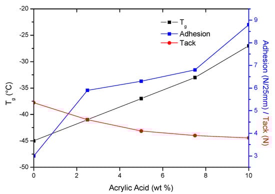 More important is the stiffness of the adhesive film, which determines its ability to wet/stick to the substrate. The sample PSA-7.5 was distinguished among all samples. Probably a good balance between crosslink density and polar carboxyl groups content in PSA-7.5 gave it higher tack. It is also known that adhesion and tack of PSAs depend on glass transition temperature of the base polymer [49]. Glass transition temperatures were determined for samples after the crosslinking process with the UV dose of 4 J/cm2 (PSAs were free from adhesive failures). The results are shown in Figure 7 as the dependence of the adhesion, tack and glass transition temperature on the acrylic acid content.
