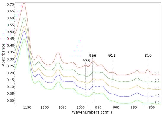 The Tg values increased with increasing AA content (from −45 to −27 °C, for 0 wt % and 10 wt % of AA, respectively). It is known that the glass transition temperature of poly(acrylic acid) is about 100 °C. Hence, its higher content in samples caused an increase in their Tg values. As the Tg values of PSAs increased, the adhesion increased and their tack decreased. The reduction in stickiness is caused by limitations in the mobility of the polymer chains at a higher Tg, thereby worse wetting the surface. The third feature of PSAs adhesives is their cohesion. The results of performed tests are shown in Figure 6c. As can be seen, the highest desired result (72 h) was achieved in the case of sample PSA-10, regardless of the applied UV dose. This is most likely due to two factors. Firstly, PSA-10 contained the most carboxyl groups, hence the most hydrogen bonds in the system. Secondly, PSA-10 had the most unreacted monomers before UV crosslinking, hence the densest polymer network was formed at the cocrosslinking stage with HTB (a large proportion of crosslinking polymerization over linear polymerization). For these reasons, the PSA-10 sample had the highest cohesion. In case of sample PSA-7.5 the cohesion values after crosslinking using 4 or 5 J/cm2 of UV dose were also excellent. However, the presence of unreacted monomers had a greater negative effect than HTB, since the latter was only 7.5 wt % in the samples and unreacted acrylate monomers from ca. 9–30 wt %. The characteristic peaks (810 cm−1; 911 cm−1 and 966 cm−1 and 975 cm−1) of PSAs crosslinked with different UV dose were monitored by FTIR spectroscopy. An exemplary FTIR spectrum (for PSA-7.5) was shown in Figure 8. This adhesive was selected for the tests due to the fact that it had the highest tack of all prepared PSAs, high adhesion and the desired cohesion after irradiation with a UV dose of 4 J/cm2. With the increasing of UV dose, the intensity of peaks 810 cm−1, 911 cm−1 and 975 cm−1 disappeared (especially after using a high UV dose, i.e., 4 and 5 J/cm2). That means, that all unreacted acrylate monomers and vinyl double bonds in HTB reacted completely. The pendant double bonds (vinyl-) and 1,4-cis double bond in HTB were readily available and therefore participated readily in crosslinking. Instead, the trans- double bonds were not fully reacted and were still present in the final product (but in a low concentration). Probably, this is due to the difficult accessibility of this type of bonds and steric hindrances in the HTB chain.