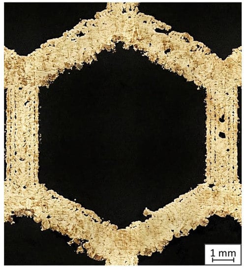 During our preliminary research connected with the numerical analysis of honeycomb structures (not yet published), it was observed that there were significant differences between experimental results and numerical analysis. The main issue was connected with significant porosity growth in the area of the thin wall visible in Figure 1.