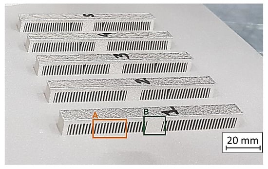 For each manufactured part, Vickers hardness distribution measurements were taken using a Struers DuraScan 70 (Struers, Copenhagen, Denmark) hardness tester. All measurements were conducted in the monolithic part of the samples (shown in Figure 3). The samples’ geometry was designed in this way in order to analyze porosity in the monolithic and thin-walled parts and to check the material condition in the areas of the “bridges”. Their dimensions were as follows: 100 mm length, 10 mm width, and 12 mm height. Thin-walled parts (area “A” in Figure 3) were characterized by a thickness of 0.75 mm and 1 mm spacing. The monolithic part of the samples in the middle (area “B” in Figure 3) had dimensions of: 10 mm length, 10 mm width, and 12 mm height.
