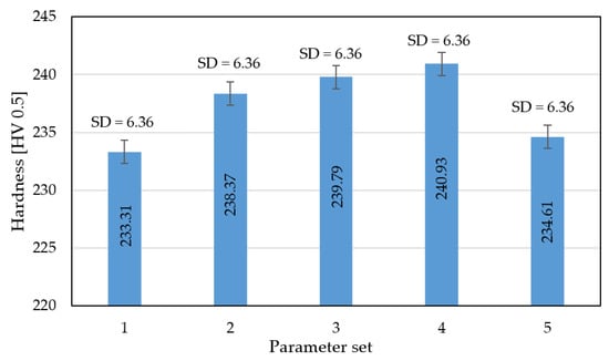 Based on the obtained hardness measurements, an initial increase and then a slight decrease in hardness is visible; this was also observed in other research [7,10] and could be connected with a kind of heat treatment effect caused by a higher temperature delivered to the material volume. As was observed in [7], higher values of average hardness are caused by increased hardness in the layer connection zone.