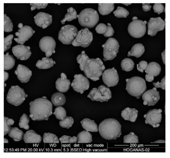 The powder used in this analysis was gas atomized AISI 316L, supplied by Höganäs, with a particle size value between 44 and 106 µm. Figure 1 shows an SEM micrograph of the powder, and the corresponding chemical composition is listed in Table 1.
