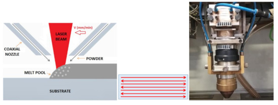 Metallic powder particles were placed in a GTV powder feeder and delivered to the process zone through a coaxial nozzle, Powerline12 from Fraunhofer IWS, using nitrogen as a carrier and shielding gas. A scheme of the coaxial cladding system is in Figure 2. A zigzag-like moving strategy was followed to build a single wall. In Figure 2 center, the arrows show the direction of the laser along each layer.