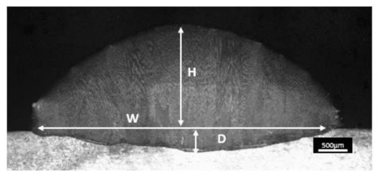 Optical microscopy (OM) of a single-clad showing the geometrical measurements.