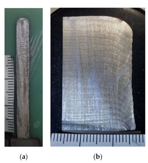 Some walls were built with a width of only one cladding track (4.5 mm) layer-by-layer until the necessary dimensions were achieved to machine the tensile test specimens. The dimensions of the manufactured wall were 4.5 × 180 × 110 mm3, Figure 5.