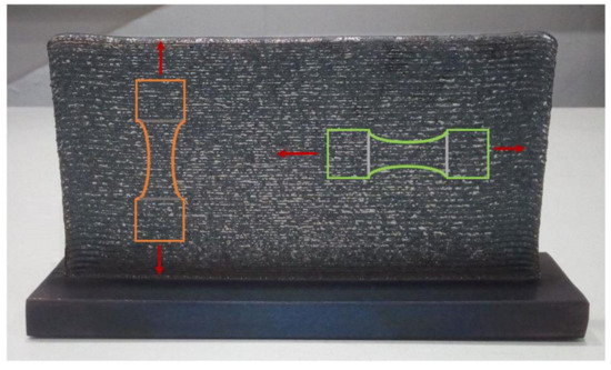 Figure 5 shows the LMD wall manufactured for this study. A homogeneous structure and height can be seen along the whole wall. Orange and green schemes inside show the orientations in which the tensile test specimens were machined. Red arrows show the direction of the uniaxial tensile tests.