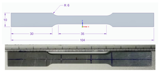 To improve the surface quality of the additive manufactured steel, a dry milling finish was applied on both surfaces of the piece. Tensile test specimens were designed according to the ASTM E-8M-04 standard. The specimens were sectioned from the additive manufactured stainless steel samples by wire electrical discharge machining (WEDM). As explained in the experimental part, the building direction is the same for all samples. The difference between the specimens studied is the direction in which the tensile samples were extracted. Orange samples are denoted perpendicular (the applied strength is perpendicular to the layers) and green sample parallel (the applied strength is parallel to the layer). Figure 5 shows the homogeneous additive part from which the specimens were machined, five specimens for each condition were tested. A scheme with the dimensions of the samples and a machined sample are shown in Figure 6.