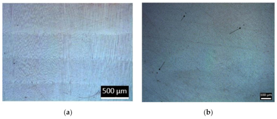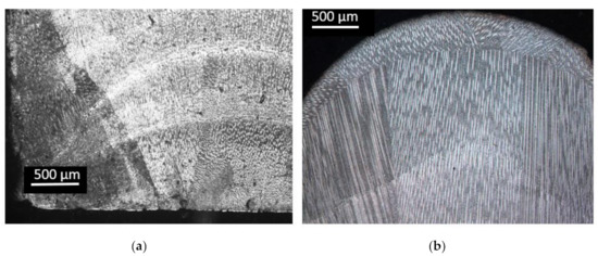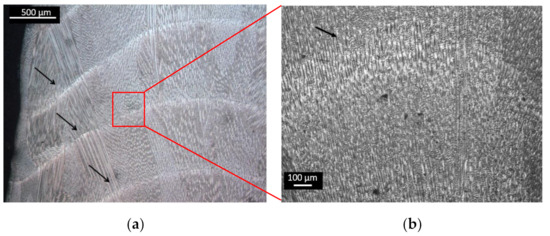Figure 8 shows two optical micrographs of the wall in different orientations, (a) parallel layers and (b) perpendicular to the layers. In the parallel section, the limit of the layers can be observed with a homogenous microstructure. In the perpendicular layer, a cellular microstructure was observed, resulting in the cutting of the grains, which were oriented in the direction of growing the wall. Small pores can also be observed in Figure 8b.