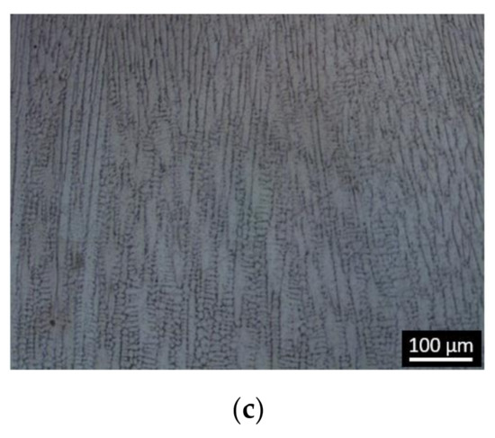 A homogeneous microstructure was observed along the cross-section of the LMD wall manufactured. Directional growth of the grain could be observed through the border of the wall due to the thermal gradient where the dissipation of heat occurs. The bonding between consecutive layers was observed, with a continuity of the grains, Figure 7a. Continuity of the microstructure along the different layers was observed in Figure 7b. In more detail, the oriented grains were seen in Figure 7c, where the direction of the heat flow was from bottom to top in the micrograph. Dendrites morphology was observed, forming columnar grains oriented along the building direction due to the solidification direction during the LMD process. In austenitic stainless steels deposited by LMD, microstructural grains and ferrite dendrites were preferentially oriented along the highest thermal gradient [34]. The orientation of the grains and dendrites had an influence on the properties of the additive piece, so this orientation of the grains had an influence on the mechanical properties as well as regarding the orientation of the tested pieces, parallel or perpendicular to the layers.