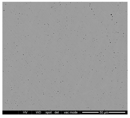 Some microporosity was observed in the cross-section of the LMD structure (Figure 8). The morphology of gas pores was typically spherical, and gas porosity appears anywhere in a component, as observed in Figure 9. Similar to what occurs in laser welding, the gas trapped during the process had no time to evacuate before the next layer, so it was entrapped in the melt pool due to the rapid solidification during the LMD process. It was important to note that the diameter of the pores was less than 5 μm. To quantify the porosity, samples were weighed after manufacturing in the final machining of them. Their volume was known from the CAD, which, additionally, was checked with accurate measurements of the real specimens. From those results, the real density of the sample was determined as 97% of the density of the bulk material. This slight difference between the bulk material and the additive manufactured parts could be related to the small size of the pores. Although there was a noticeable amount of pores, as shown in Figure 9, their small diameter, around 1–2 µm, had a limited impact on the global density of the sample.