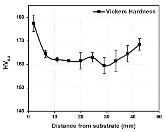 Hardness values were carried out in the transversal section of the LMD wall from the area near the substrate to the top of the wall. Figure 10 shows the curve of hardness values, an average of three values taken in different areas of the piece built. Moreover, along the structure, some discontinuities in the microstructure could be found. The indentations to measure the hardness were made randomly along the surface, so if the indentation is in the middle of a layer or in the intersection between two layers, there could be a variation of the hardness values. For this reason, the uncertainty values are also shown in the graph by the straight line. As can be seen in Figure 10, the values were quite similar along the wall, which means that the additive material had a homogeneous microstructure along the manufactured piece. However, the highest values were found near the substrate. This was due to the fact that the cooling speed around the substrate was higher due to the dissipation of heat by conduction through the substrate resulting in a finer microstructure in this area. An increase in the hardness was also observed at the top of the structure due to the higher cooling rate in this area. In any case, the tensile test specimens were machined from the center of the wall, where the hardness values were homogeneous.