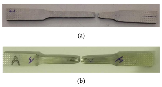 Photograph of two tensile test specimens after being tested. (a) In perpendicular and (b) parallel directions.