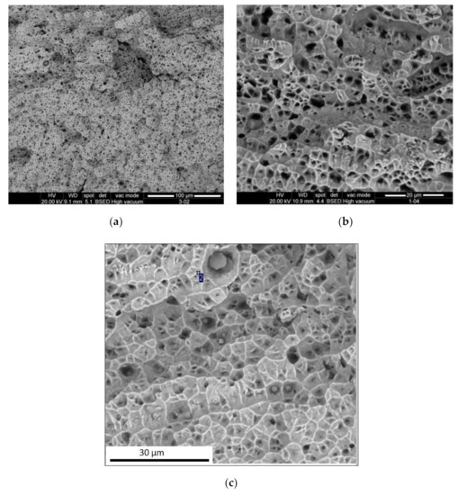 Figure 13 shows the SEM fractographies of the samples after tensile testing. Dimple morphology dominates on the fracture surface of all samples, which is indicative of a ductile fracture mode. Small particles were found inside the dimple of the fracture (Figure 13c), similar to that observed by other authors [35], which was related to oxides. These internal particles can affect the mechanical properties and be the cause of the minor values of yield strength obtained in this study.