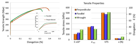 To study the mechanical behavior of the wall generated layer-by-layer with only one laser track, uniaxial tension tests were performed to determine the ultimate tensile strength (UTS), yield strength (σ0.2) and elongation at break (ε). LMD-like standard tensile test specimens extracted at different orientations: parallel and perpendicular to the layers were studied, meaning, with any post-treatment. It should be noted that the data were obtained by mathematically averaging the test results of five samples for each direction extracted from the same wall. Figure 14 shows the curve and results of tensile properties. LMD samples have reduced tensile test and relative elongation as compared to the wrought stainless steel. The values are similar to those found in additive manufactured samples at a high process speed [14]. With respect to the orientations studied, samples extracted in perpendicular orientation have higher UTS than the sample extracted in a parallel orientation, while less yield strength is observed in perpendicular orientations similar to those obtained in [36] (Yield strength 207–261 and UTS 414–539), also for perpendicular orientation. Similar elongation is observed in both orientations, being higher for the perpendicular orientation, 30%, than parallel orientation, 25% of relative elongation.