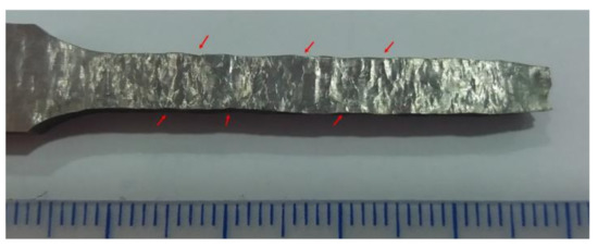 According to the standard specification of ASTM (UTS 480 MPa and σ0.2 205 MPa) for wrought 316L stainless steel [38], UTS and σ0.2 achieved in both studied conditions (perpendicular and parallel) are higher. The Young’s modulus of the specimens studied in this work was slightly lower, as was the relative elongation. These lower properties were attributed to the emergence of some striations, which could be observed in the tested zone of the perpendicular samples. This phenomenon was associated with the deformation of the layers deposited during the tensile test. At the side of the tested sample, some oscillations were noticed, with alternate narrowing of the sample along the stretched length, as can be observed in Figure 15, indicated by red arrows.