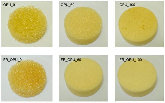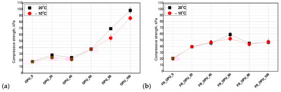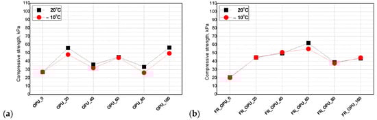 Compressive strength ranged between 20–100 kPa and 20–60 kPa for the foams without and with TEP, respectively. It was concluded that the measurement temperature does not have a significant influence on the mechanical properties of the foams and such materials can also be used at temperatures below 0 °C. A correlation between the bio-polyol content and both the compressive strength and apparent foam density was observed. The higher the apparent density, the higher the compressive strength of OPU_80 and OPU_100. Gosz et al. observed a similar effect in the case of polyurethane–polyisocyanurate foams. In that work, the compressive strength and apparent density ranged between 105 and 375 kPa and 39–43 kg/m3, respectively [30].