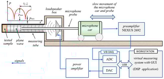 The measuring system used to conduct the tests was partially based on elements of a 4002 (B&K) Standing Wave Apparatus (such as measuring tubes, loudspeaker and microphone probe) [24]. However, a low-noise preamplifier NEXUS type 2692 (Brüel&Kjær, Nærum, Denmark), a power amplifier type A5512 (Radmor, Gdynia, Poland), a 24-bit VibDaq 2+ signal acquisition module (EC Electronics, Kraków, Poland) and a digital signal processing application were used to create a hybrid signal conditioning and signal processing system. The digital signal processing application was developed in the DASYLab® programming environment (Data Acquisition System Laboratory Ver. 7, DASYTec, Amherst, NH, USA, a National Instruments Company). A simplified diagram of the measurement system used to determine the sound absorption coefficients is shown in Figure 2.
