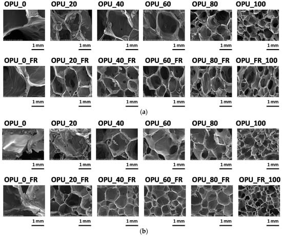 The size and shape as well as the content of open cells are important parameters of foam cellular structure, which is directly related with thermal insulation and mechanical properties of a PUR foam. The influence of the used cooking oil-based polyol on the cellular structure of the PUR foams was examined using SEM (Figure 3). The average equivalent diameter and content of closed cells are listed in Table 1.