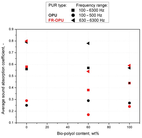 In the literature, there have been few studies discussing the influence of bio-components on the acoustic properties of open-cell PUR foams. PUR foams are generally used in thermal insulation materials but their porous structure allows for their use as sound absorbers. It is possible due to cavities, channels or interstices present in their structure. The frictional forces between the air flow and cell walls convert the sound energy into heat when sound waves flow through an open pore [1]. Gama et al. have described the sound absorption properties of rigid polyurethane foams produced from crude glycerol (CG) and/or liquefied coffee grounds-derived polyol (POL). Due to a different lignin content, the POL-based foams had slightly higher sound absorption coefficient values at lower frequencies while the CG foams had higher sound absorption coefficient values at higher frequencies [1]. The presence of lignocellulosic materials increased cell sizes of the foams and their stiffness, which increased the sound absorption at low frequencies. The lower stiffness of the foams based on CG improved their acoustic properties at higher frequencies. However, the PUR formulation has an important influence of the foaming process and cell structure and as a consequence on the sound absorption ability (at various frequencies) of foams. The behavior of PUR foams modified by varying the weight proportions of the main components (polyol and isocyanate) and foams with fixed ratios of polyol to isocyanate but different apparent densities was analyzed by [15]. They revealed that an increased polyol content gives rise to improved sound absorption behavior, particularly in the medium and high frequency ranges. It was also found that the improved mechanical energy dissipation behavior went alongside the reduced acoustic energy absorption performance, which might be attributed to the cell structure of the investigated foams. This work focuses on the relationship between the content of bio-polyol based on waste cooking oil and the mechanical and acoustic properties of bio-foams. Additionally, the effect of flame retardant, which also acts as plasticizer of the PUR matrix, on the mechanical and acoustic properties is discussed.