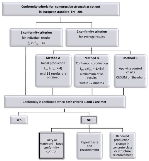 Statistical-fuzzy methods of conformity control could be applied as tools supporting initial production. Assessing the concrete class by determining the degree of certainty of concrete belonging to the class intended at the design stage could be an effective tool in decision-making in view of uncertainties related to concrete classification. The place of the proposed method in the conformity control process is presented in Figure 2.