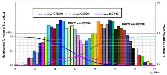 The procedure of statistical-fuzzy conformity control (Section 2.2) was carried out for concrete of class C20/25. By generating 100,000 groups of random numbers of size n = 3, consistent with normal distribution, marginal distribution density functions and fuzzy membership functions were estimated for concrete class C25/30 and every second adjacent concrete class, C16/20 and C25/30.