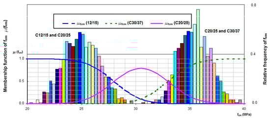 In order to determine the membership function for the considered concrete classes (three adjacent concrete classes), statistical-fuzzy method (three-phase method) was applied [42,43]. The method proposed elaborates on the concept by Woliński [43].