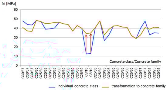EN 206 [32] standard does not specify the range of compressive strength. When considering the concrete family composed of four concrete classes: C8/10, C20/25, C25/30 and C30/37, it may be concluded that combining all four classes, i.e., a wide range of classes, is not an appropriate practice. Low values of compressive strength are masked by high values of compressive strength of referential concrete (Figure 6) through transformation and application of the proportionality principle-based method in compliance with CEN CR 13,901 report [45].