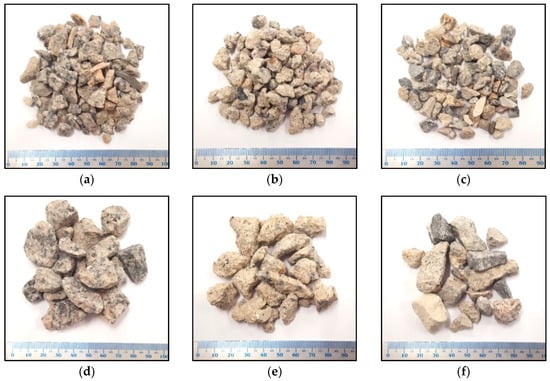 Natural coarse aggregates (NCAs) and recycled concrete aggregates (RCAs) used in this study. (a) NCA_C0; (b) RCA_L_C0; (c) RCA_D_C0; (d) NCA_C1; (e) RCA_L_C1; (f) RCA_D_C1 (adapted from []).