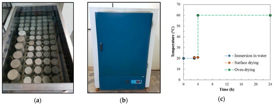 The degradation process by wetting and drying cycles started at the age of 28 days. Cylindrical samples, 75 mm in diameter and 150 mm in height, were used. Initially, the samples were saturated in water for 48 h, and then the cycles started. The durability test of concrete samples subjected to accelerated wetting and drying cycles was based on NBR 13554 [] and ASTM D559 [], and was performed manually and with the use of a water tank (Figure 2a) and a laboratory oven (Figure 2b). Each cycle consisted of the following three stages (as shown in Figure 2c): immersion in water at 20 °C for 3 h; superficial drying at 21 °C for 1 h; and, finally, oven-drying at 60 °C for 20 h. The total time of each cycle was 24 h and samples were submitted to 0, 25, and 50 wet-dry cycles.